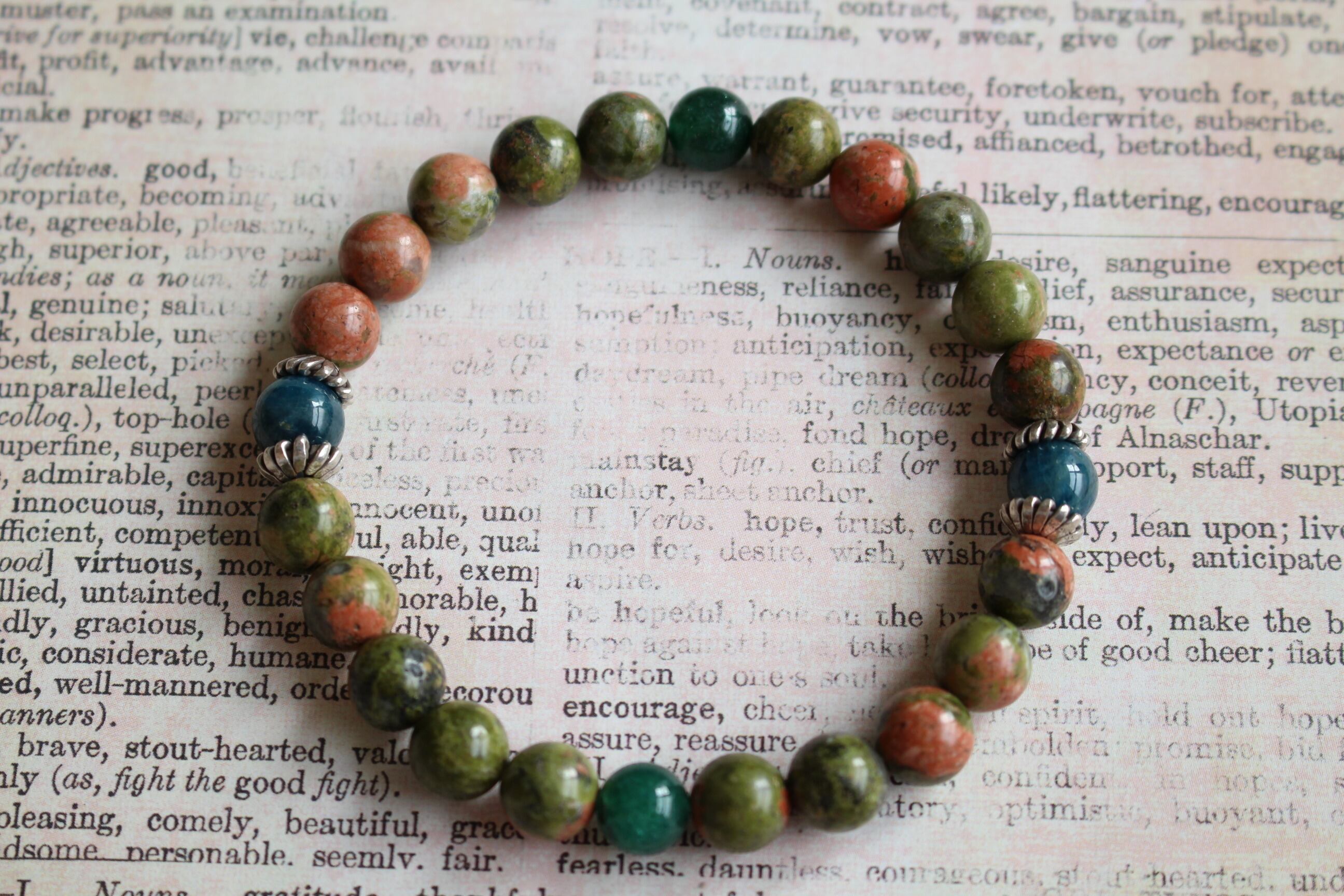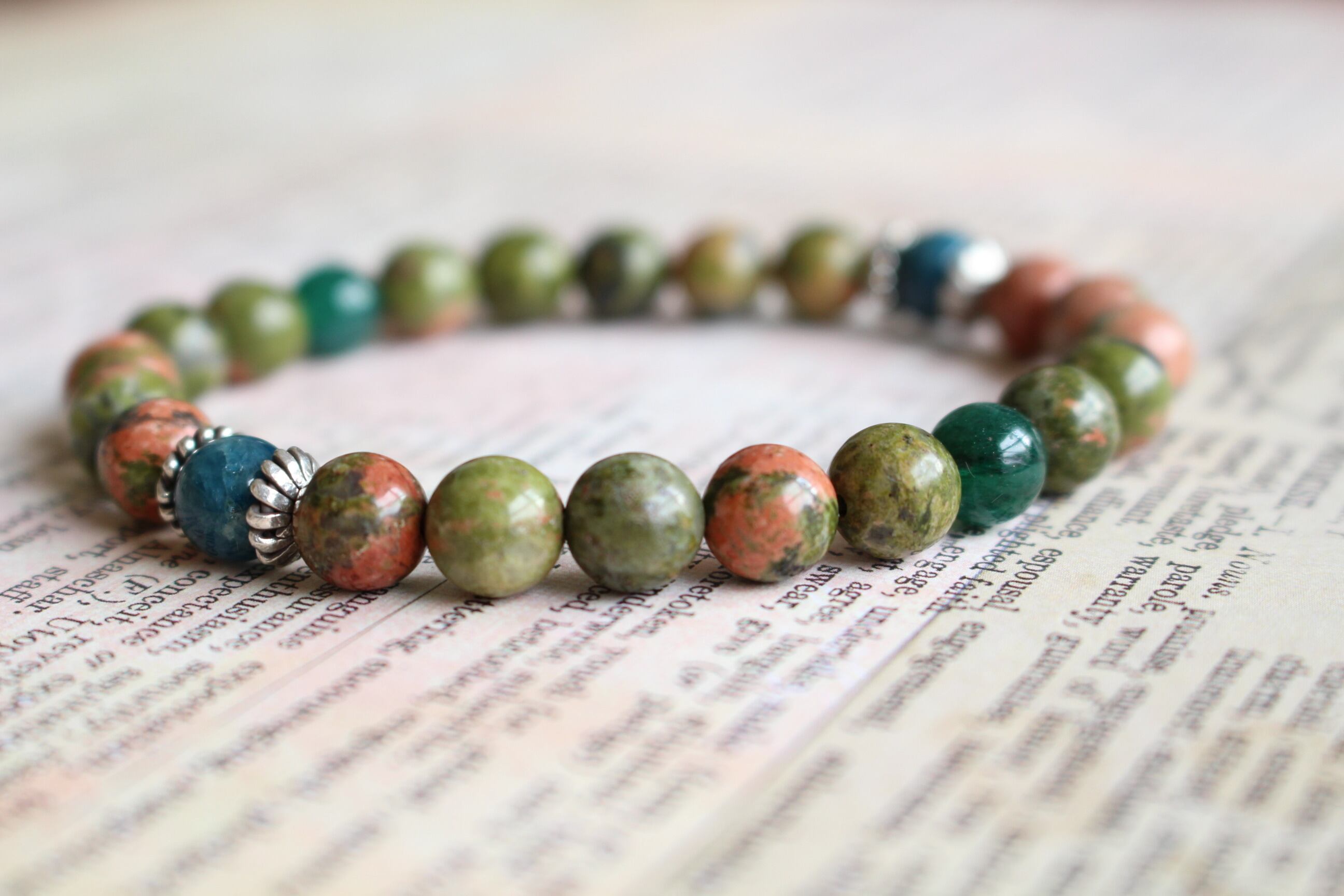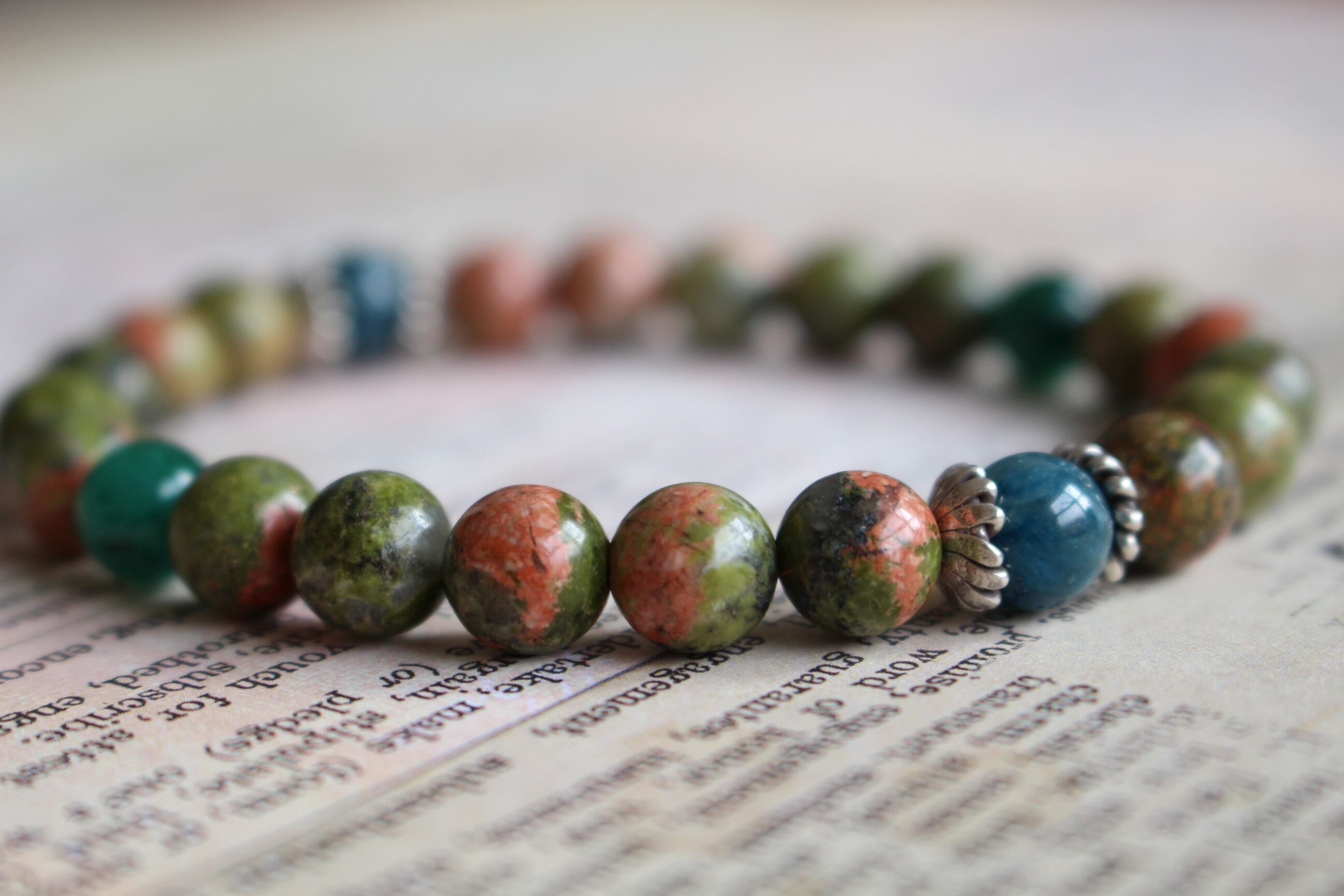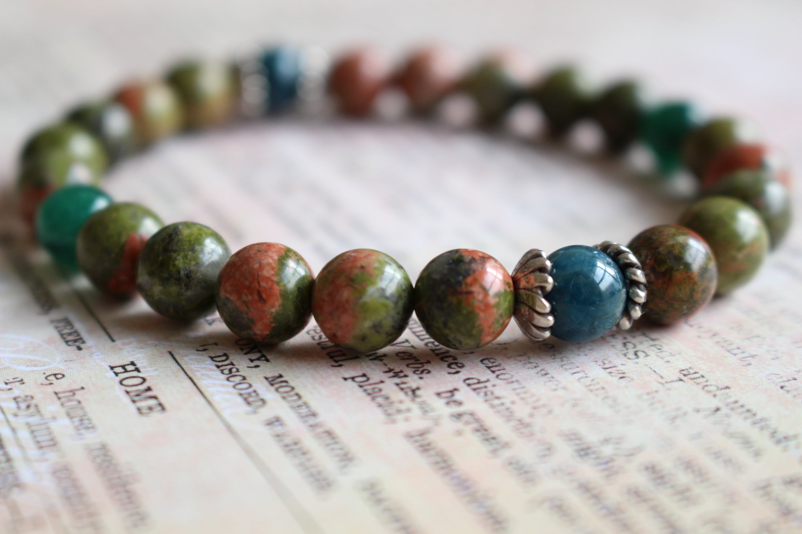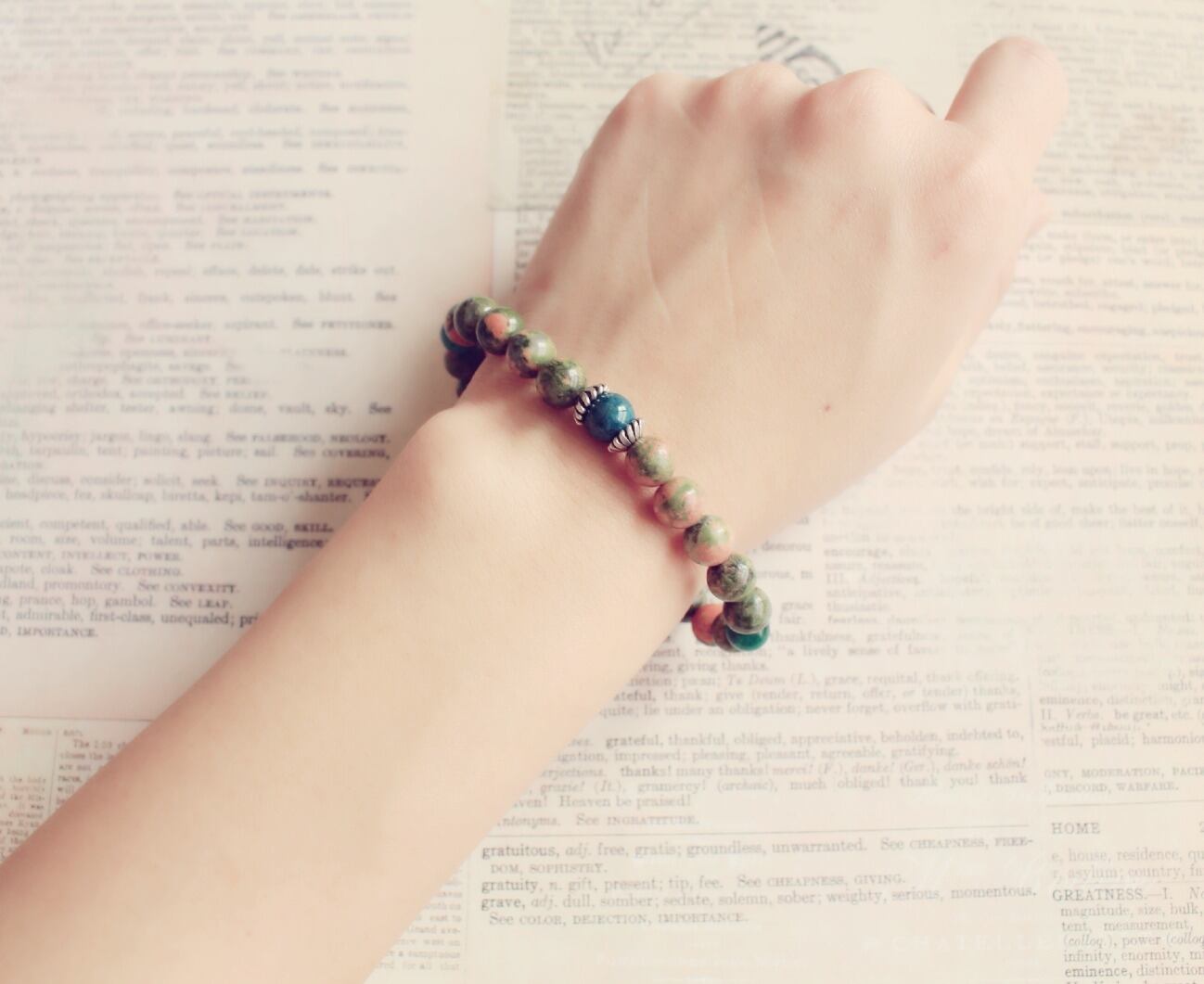 緑色、濃い緑色、ピンク色、白色などが混ざり合い、複雑な色あいや表情を見せてくれるユニカイトをメインにブルーアパタイト、グリーンアベンチュリンを合わせ、アクセントにシルバーを合わせました!複雑な色がどんなファッションにも合わせやすく品のあるブレスレットです。