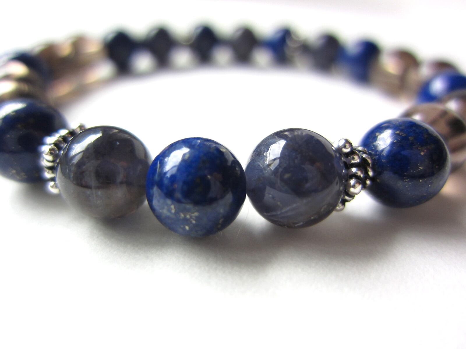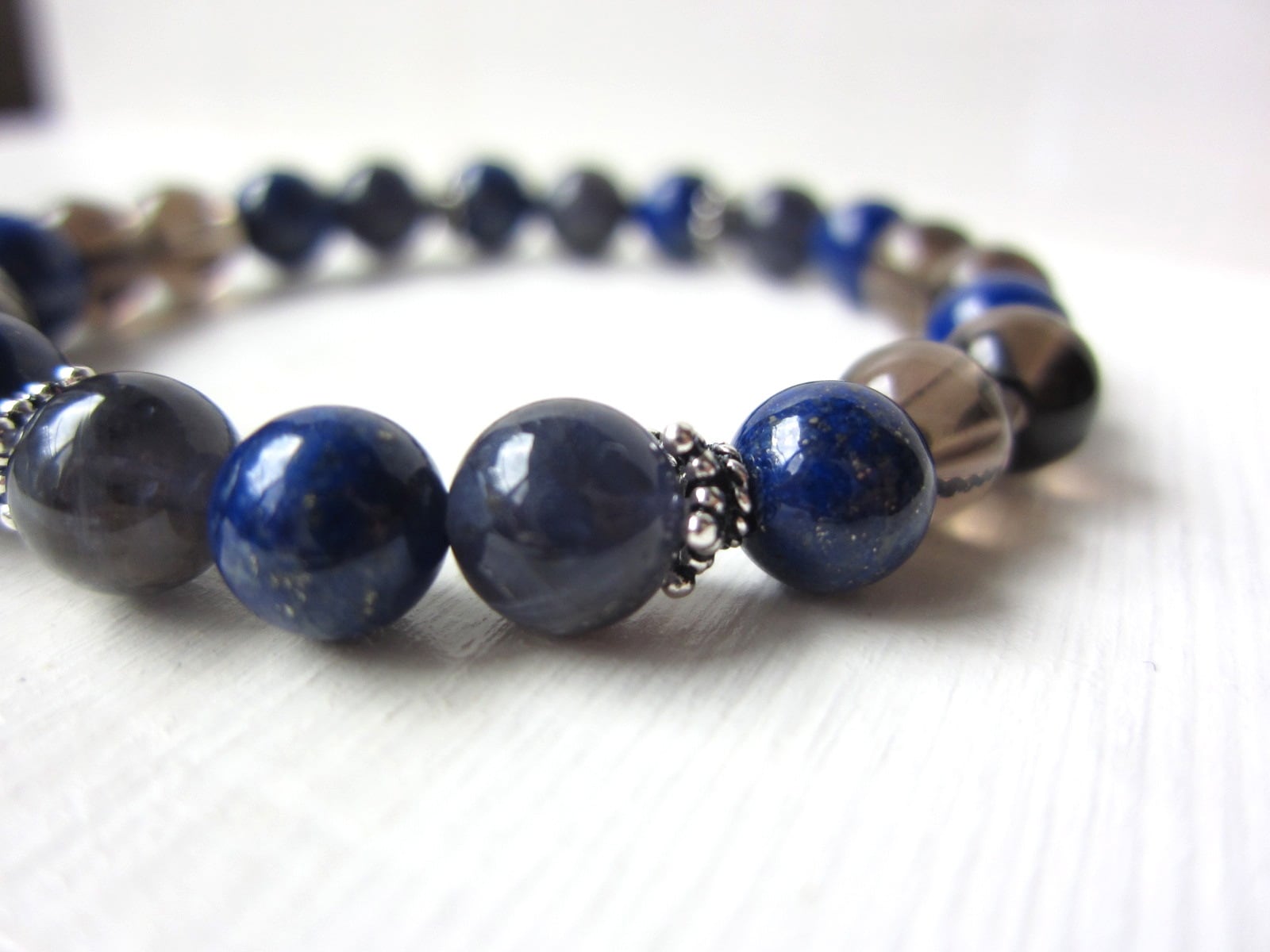 美しい濃いブルーに金色のパイライトが入ったとてもきれいなラピスラズリに、優しいすみれ色のアイオライトを合わせ、スモーキークォーツとシルバーパーツで男性のお洋服にも合わせやすいパワーストーンブレスレットを作りました^^