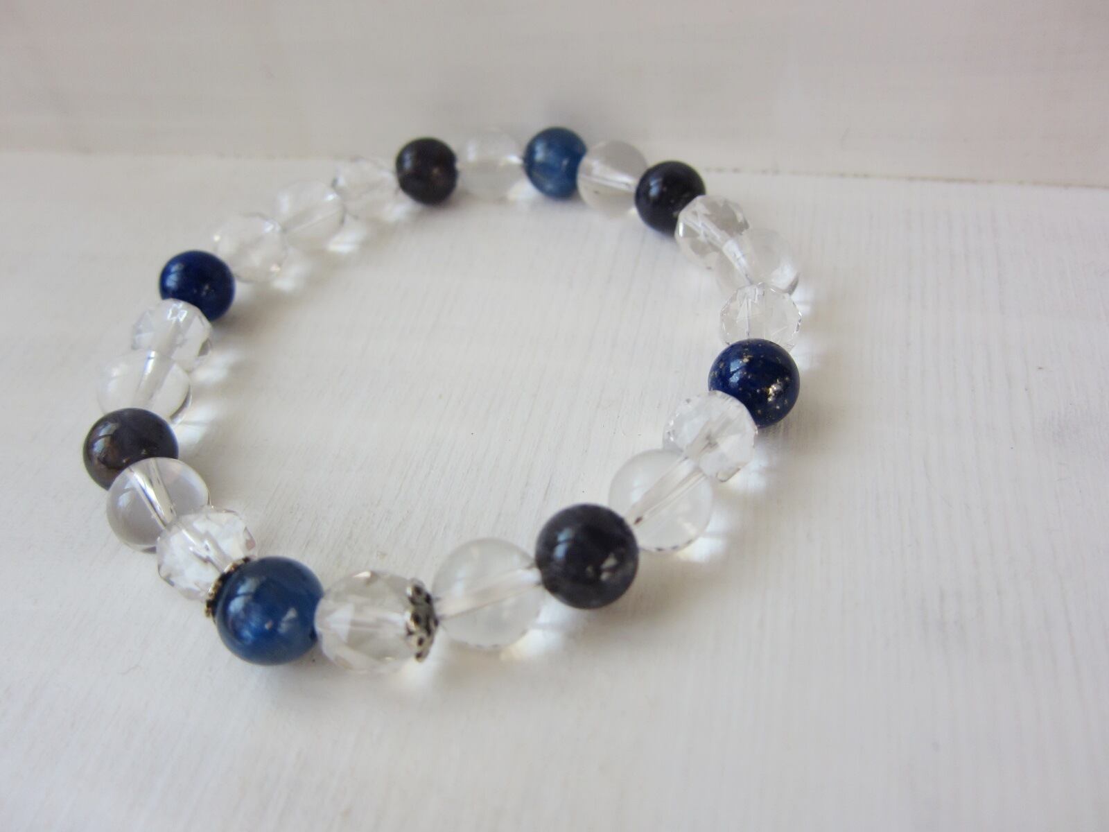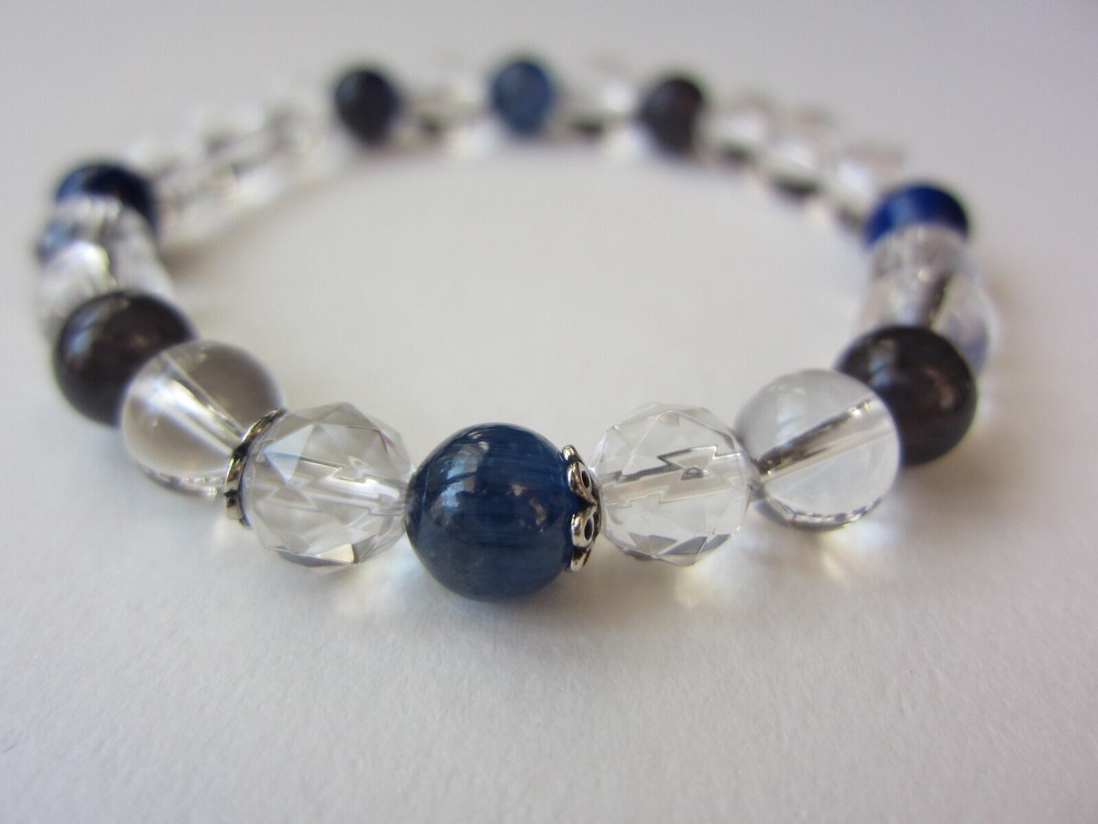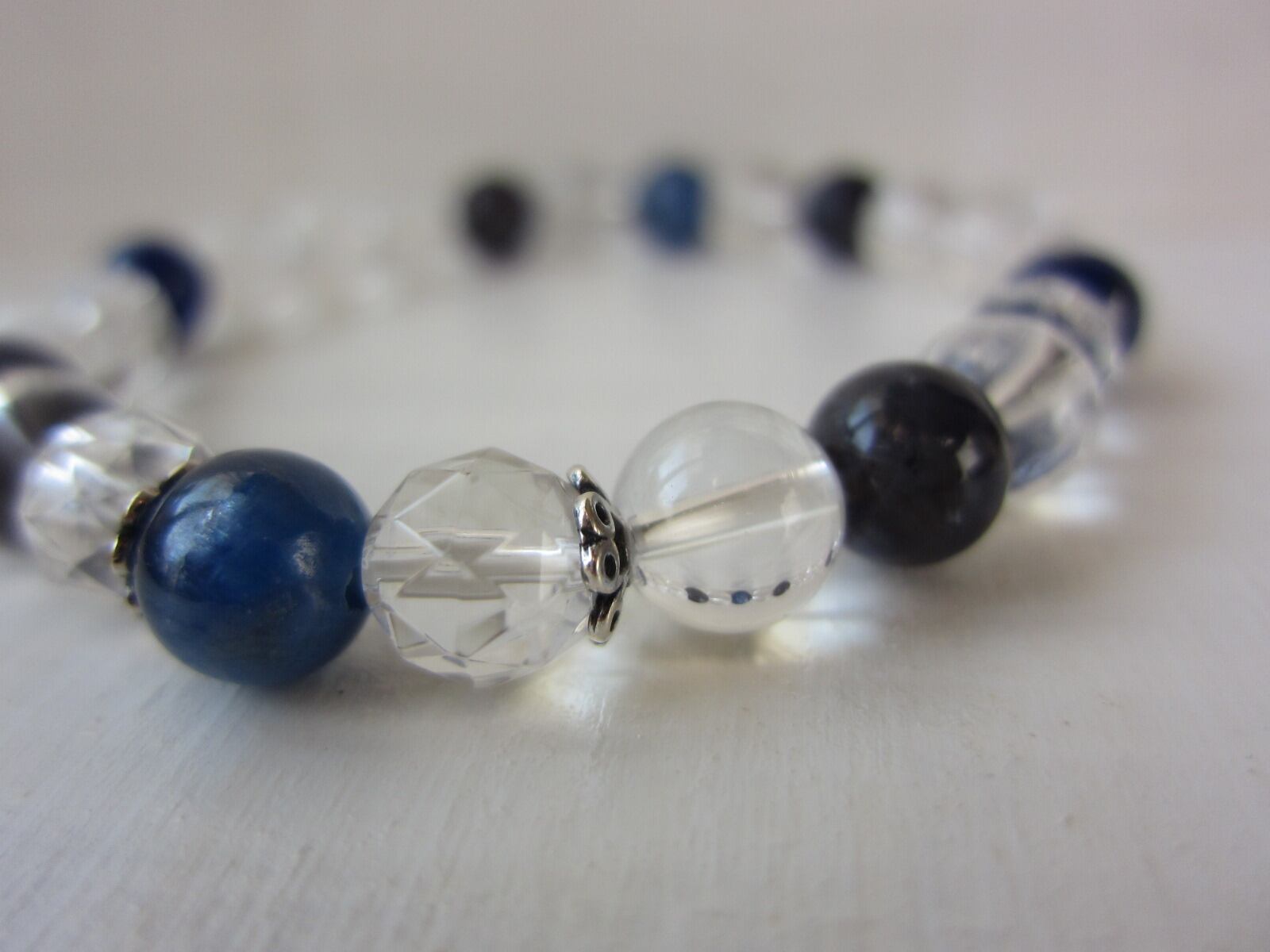 濃紺のラピスラズリ、青紫色のアイオライト、澄んだ海のようなカイヤナイト、それぞれの違ったブルーをちりばめたパワーのあるブレスレットを作りました^^