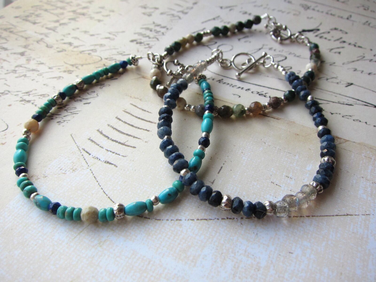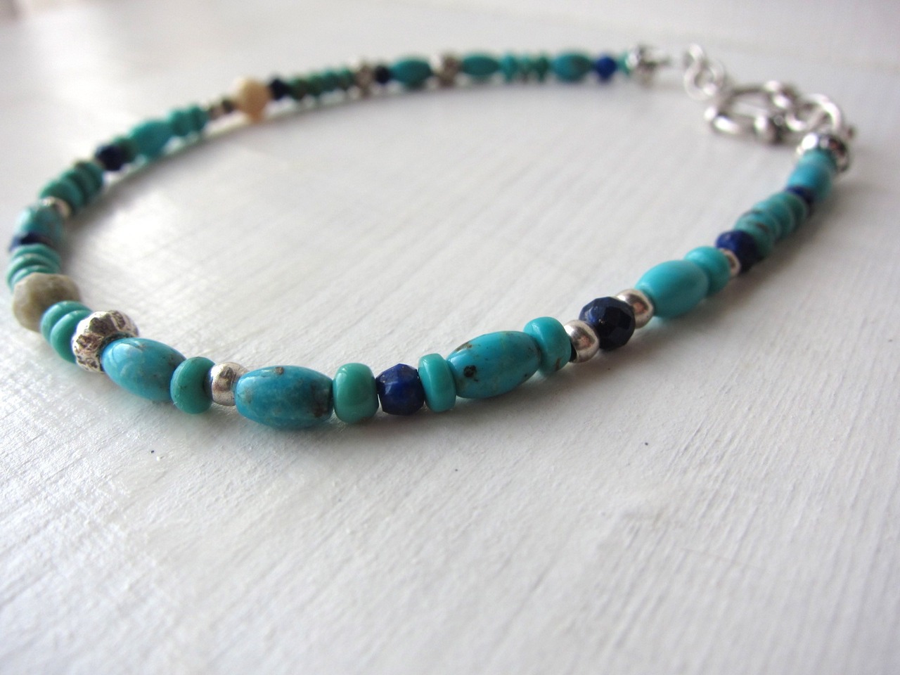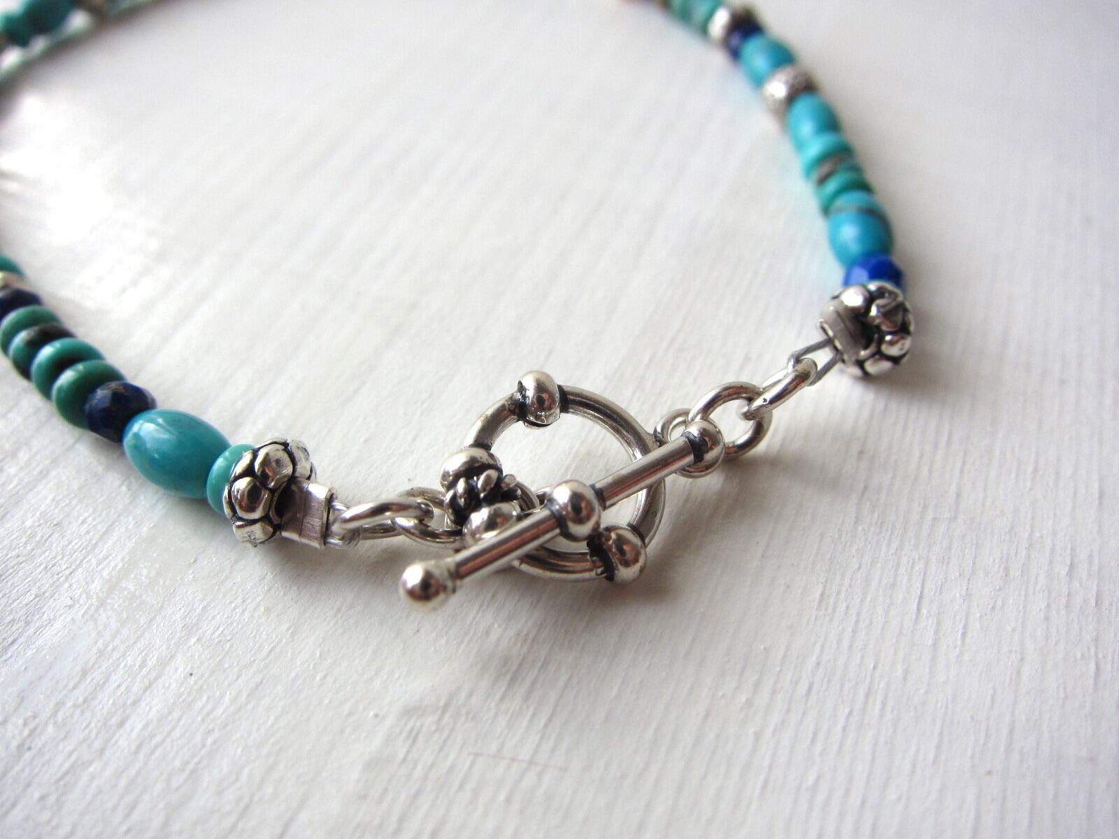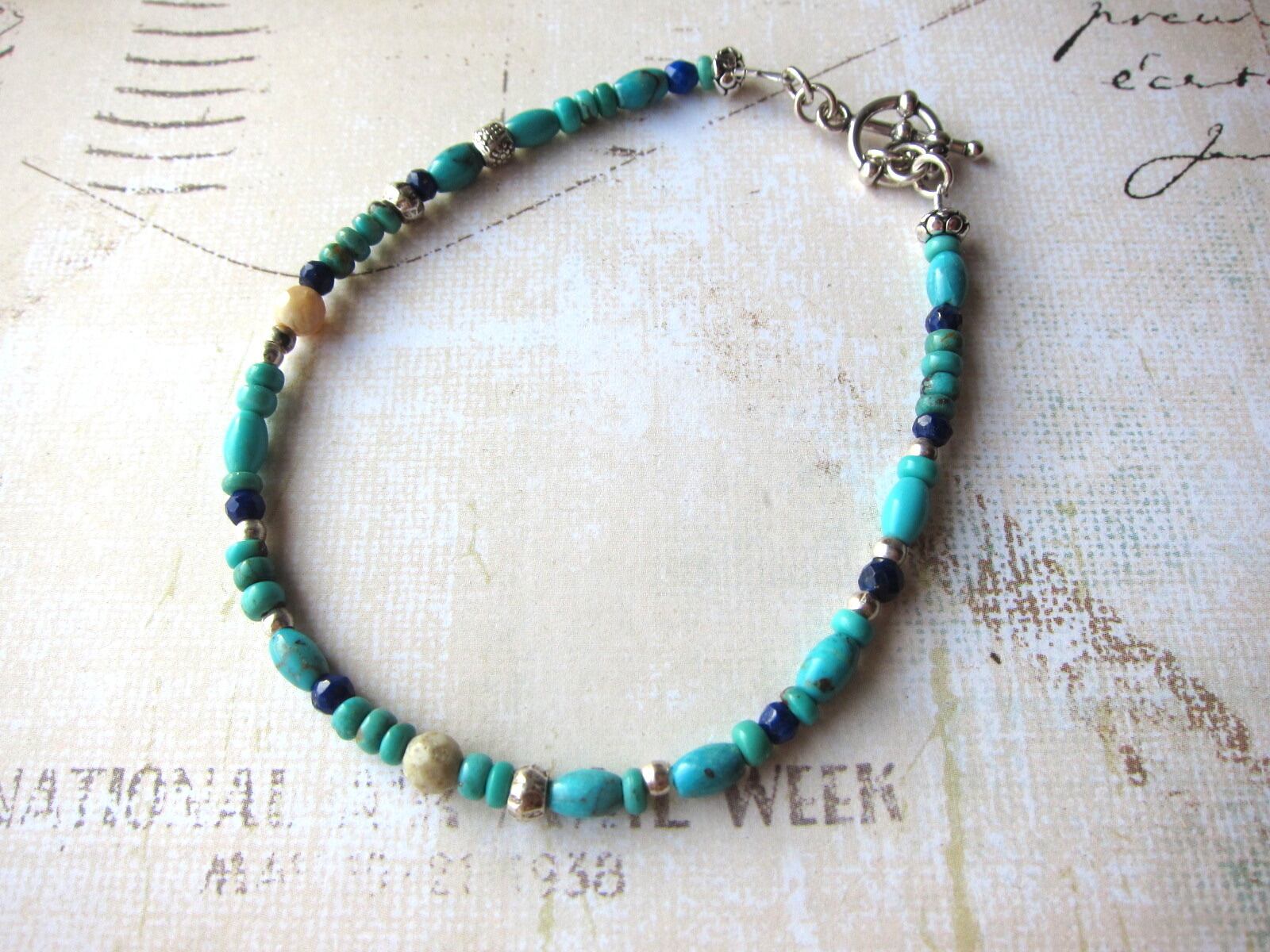 天然のターコイズをメインに、ラピスラズリ、アフリカンオパール、色々なデザインのカレンシルバーをふんだんに混ぜて使った、天然石のパワーあふれるブレスレットです!