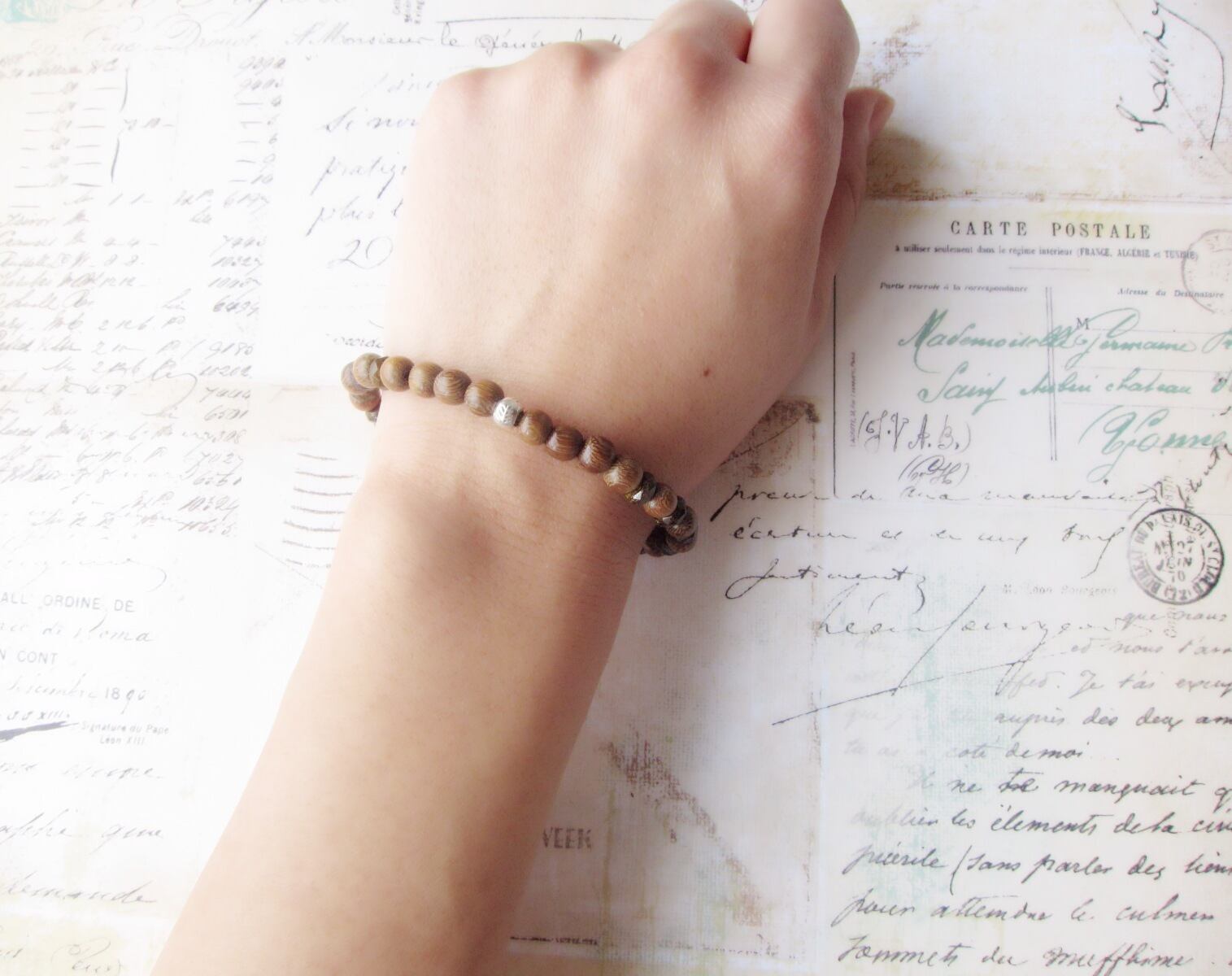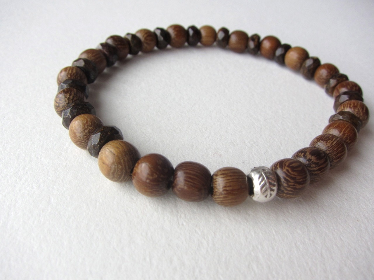 落ち着きのあるブラウンのブロンザイトに、前回好評だった丸くカットされた木を合わせ、カレンシルバーをアクセントにしたナチュラルなブレスレットができました^^とても軽く付け心地の良いブレスレットです。