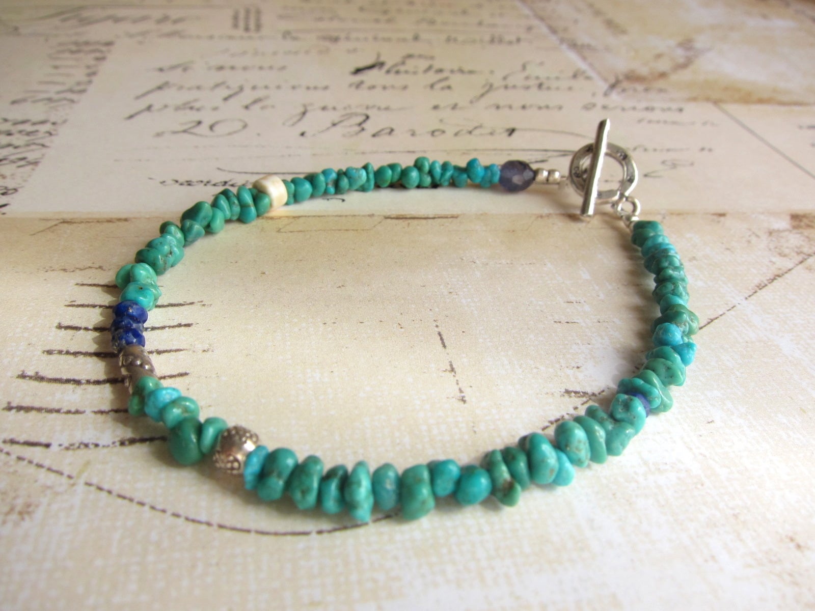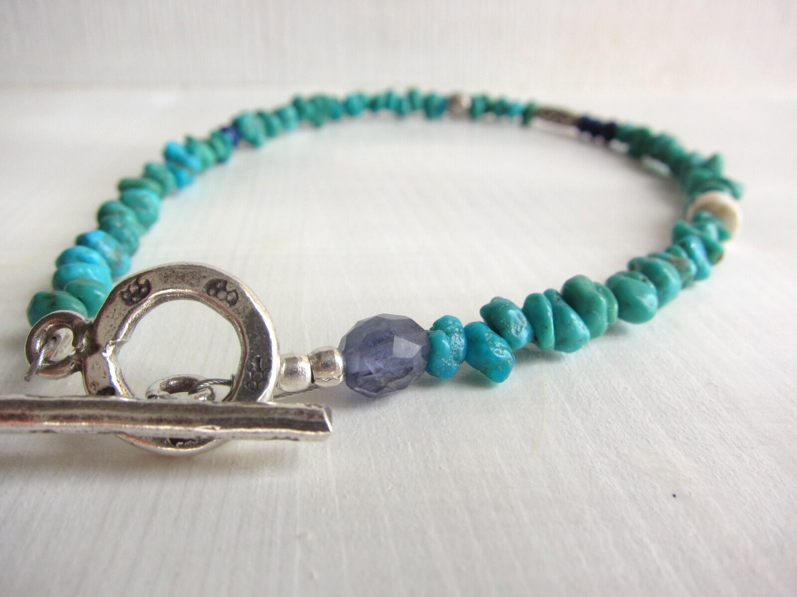 天然ターコイズをメインに、アイオライトをポイントにして、ラピスラズリ、カレンシルバーを組み合わせたとてもパワフルなブレスレットです!