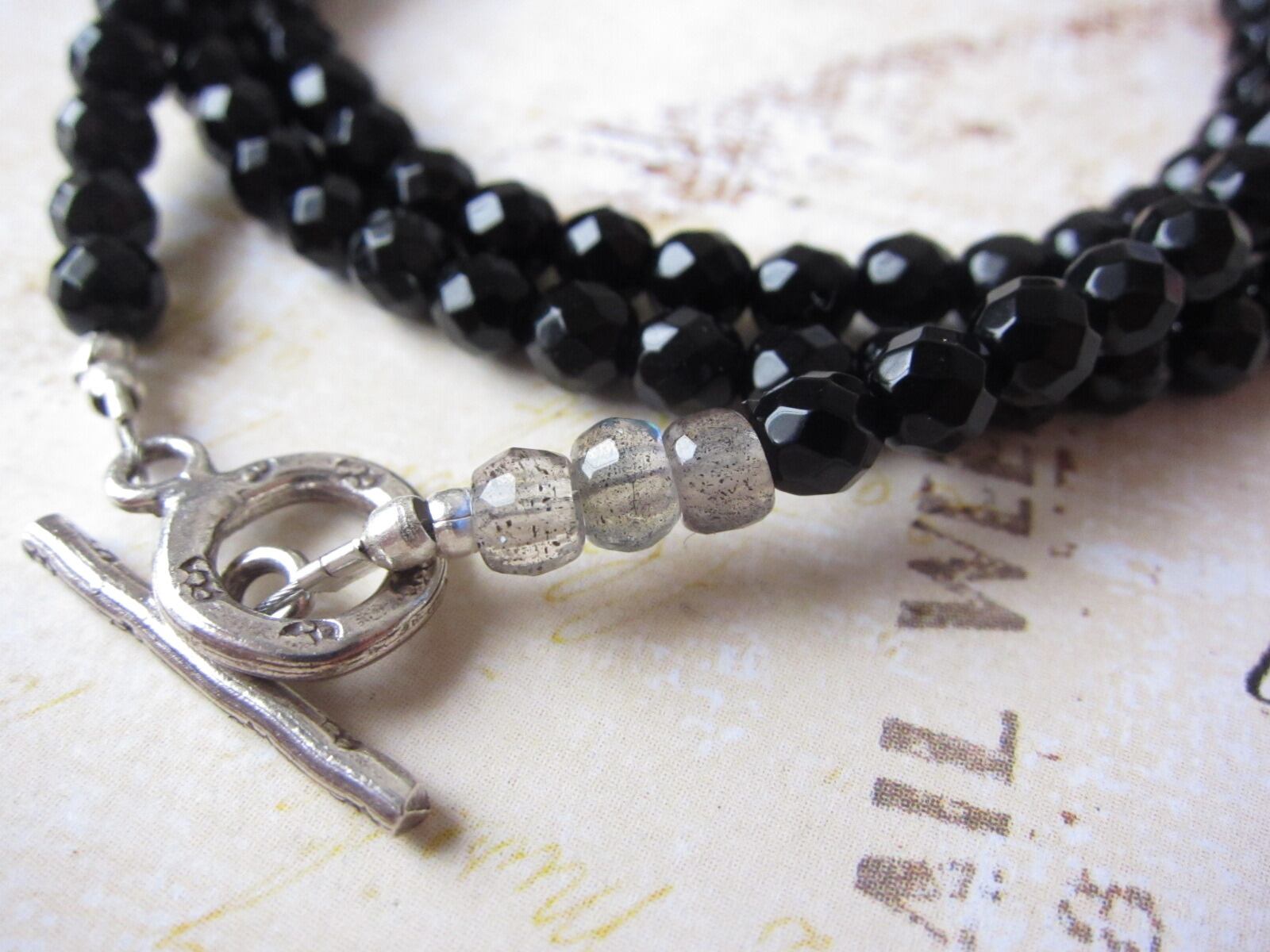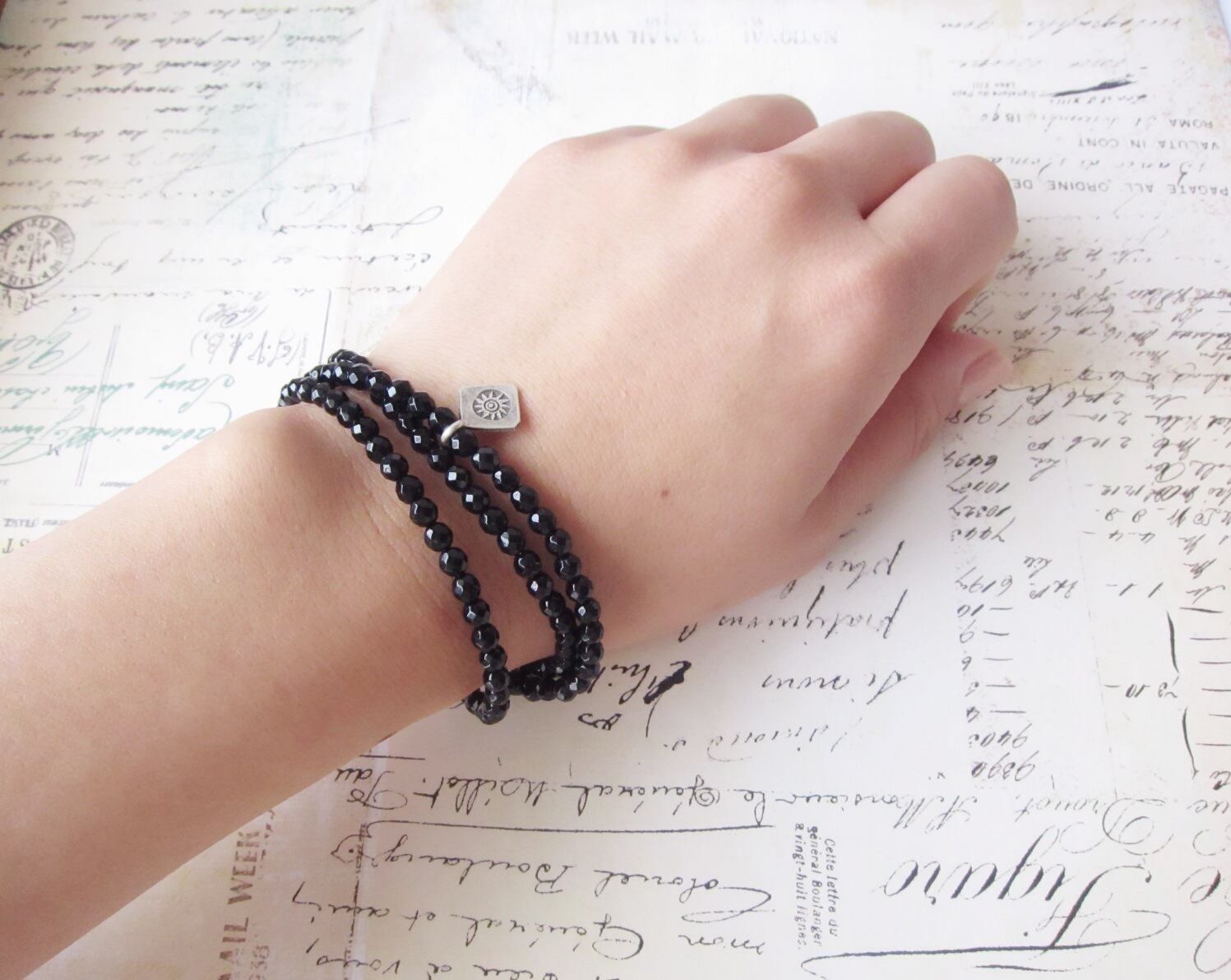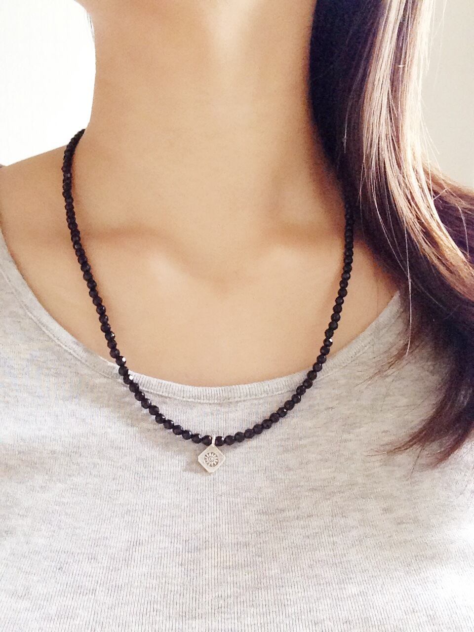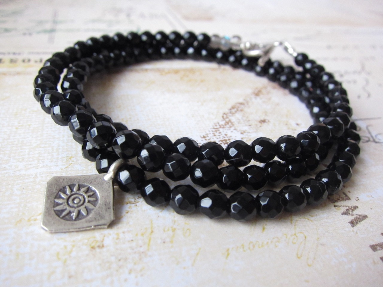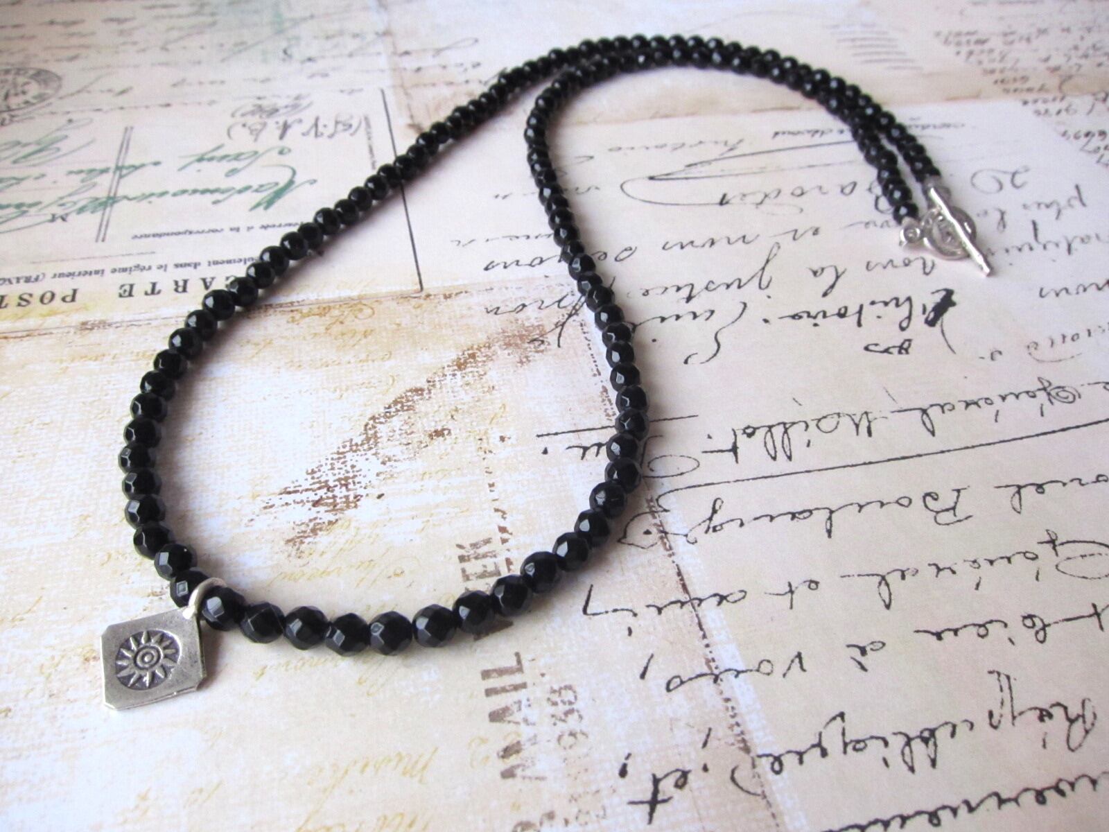 とても人気のある天然石オニキスに、太陽モチーフのカレンシルバーチャームを、マンテル(留め具)部分にはラブラドライトをポイントにあわせたアクセサリー!